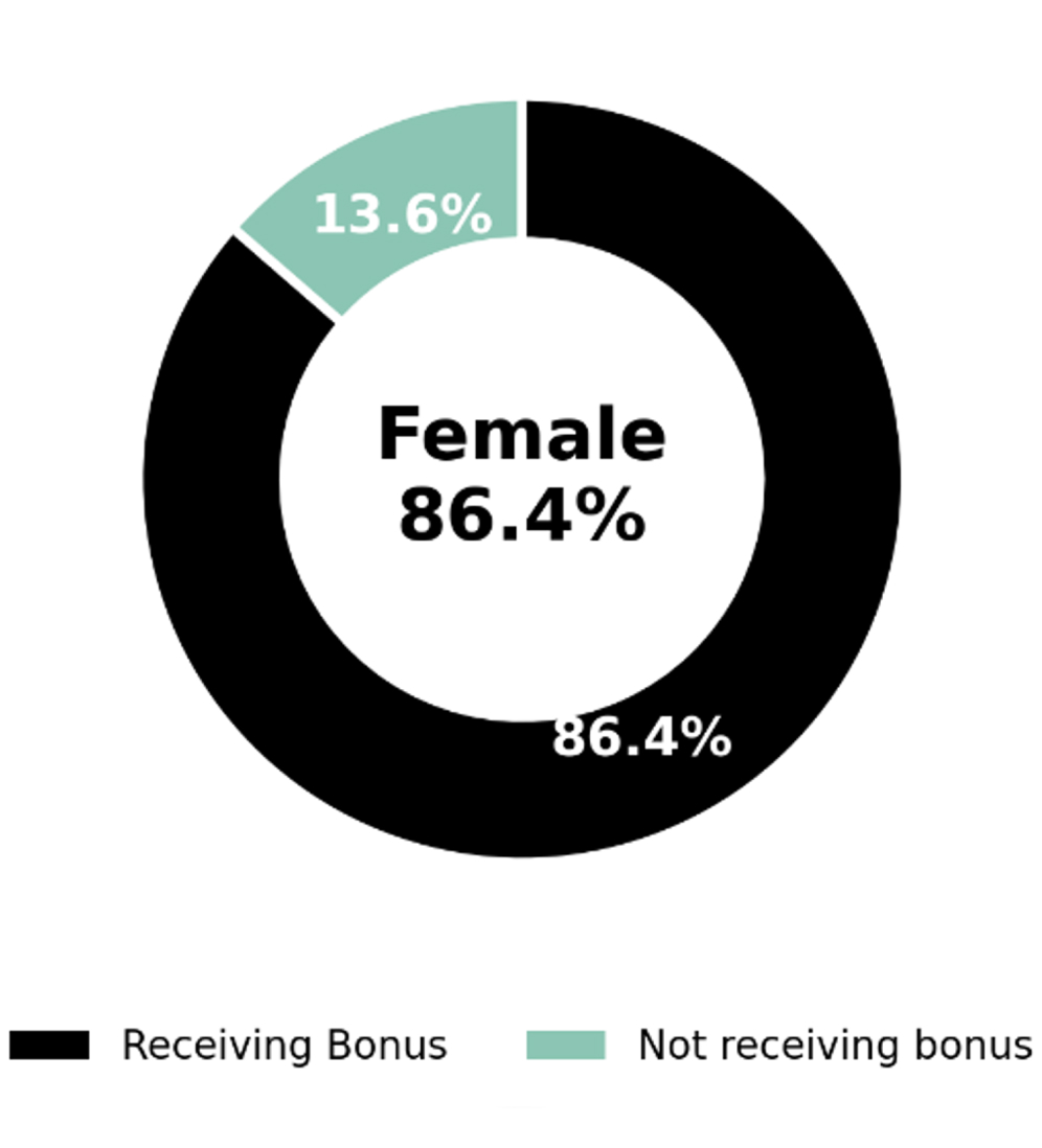 Furthermore, the proportion of females receiving a bonus has increased substantially to 86.4%, narrowing the gap with the 96.8% of males who received a bonus. This is a marked improvement from the previous year, where female bonus participation had seen a decline. This is due to the Retail Support Centre receiving a bonus in the 2024-2025 reporting year, where we see a higher proportion of women in the workforce,