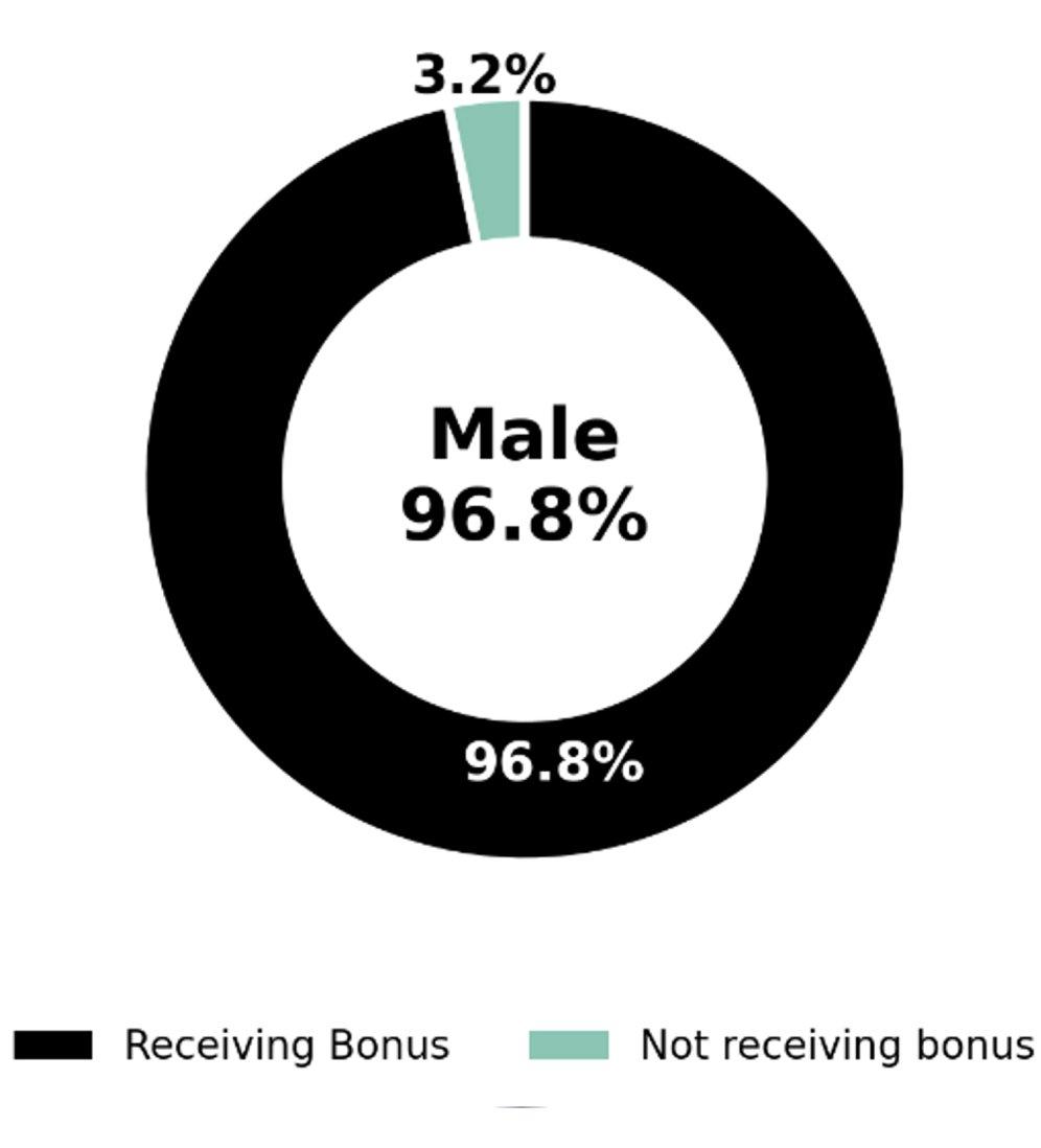 The median pay gap in bonus payments between men and women shows that males received a higher bonus amount in comparison to females. However, we have seen a significant improvement in this area compared to the previous reporting year. The mean bonus gap has reduced to 32.0% (down from 55.5%), and the median bonus gap has decreased to 48.3% (down from 76.5%).